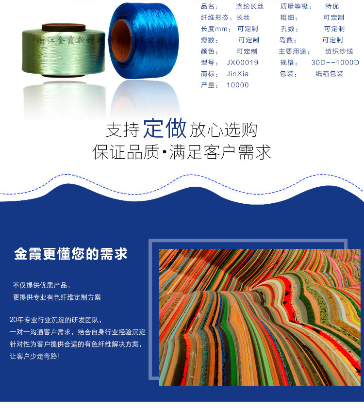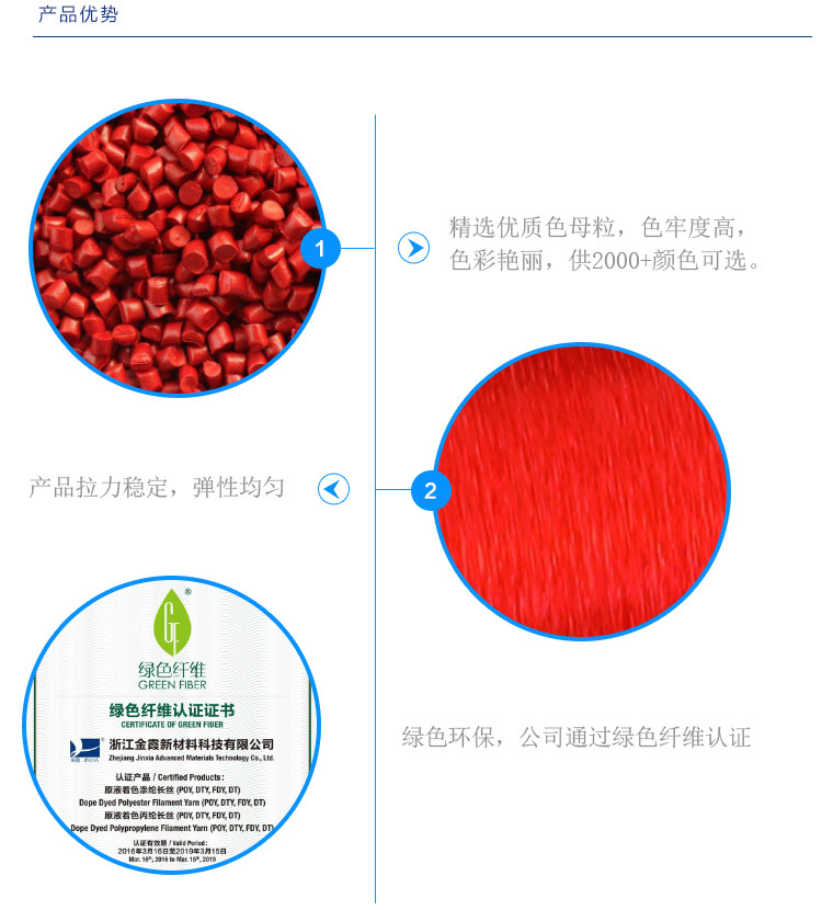 特點:環(huán)保、色牢度高、顏色均勻、光澤柔和、手感舒適、耐磨性好、收縮穩(wěn)定等優(yōu)點。