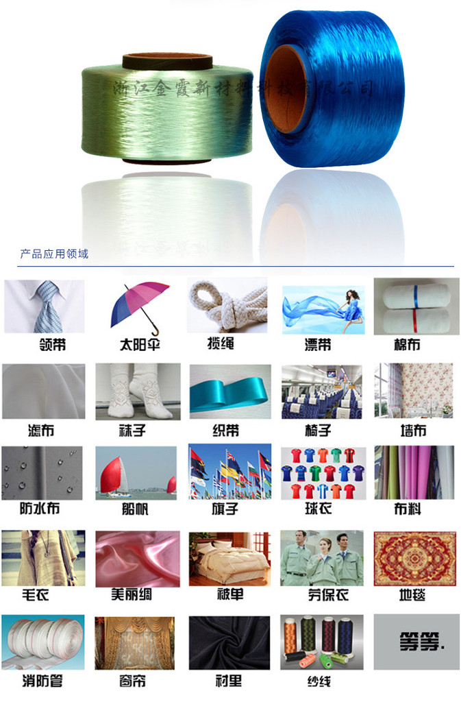 用途:適合高速整經(jīng)機(jī)及高速無梭織機(jī)的要求,直接用于針織和經(jīng)編。廣泛運用在春亞紡、搖粒絨、單面絨、金光絨、絲光絨、燈芯絨、花點絨、經(jīng)編拉毛絨、經(jīng)編短毛絨、經(jīng)編條絨、經(jīng)編平絨、經(jīng)編網(wǎng)眼布、經(jīng)編絲光綢、圈絨、平絨、五枚緞、滌塔夫、絲光綢、噴水輕盈紡(仿真絲)、噴水八枚緞、緯條牛津布、套格牛津布、提花窗簾、印花窗簾等面料。也適用于繡花、交織、鞋帽、地毯、圍巾等。