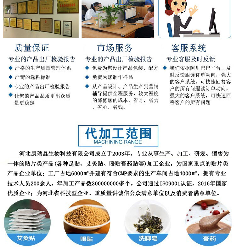 河北康瑞鑫生物科技有限公司成立于2003年,坐落于古城——正定;專業從事生產、加工、研發、銷售為一體的貼片類產品(各種足貼、艾灸貼、暖貼、膏藥貼等)加工企業,為重點的貼片類產品企業單位;主工廠占地6000㎡并建有符合GMP要求的生產車間占地4000㎡,擁有專業技術人員200余人,現有生產車間分別在4個不同地區,年加工產品數300000000多個,產品遠銷美國、加拿大、俄羅斯、新西蘭等國。公司堅持品牌意識和產品質量;通過ISO9001認證,2016年優質企業;為河北省科技型企業、重質量講誠信公眾滿意單位、河北省電子網絡貿易商會會員單位、以及消費者滿意單位。