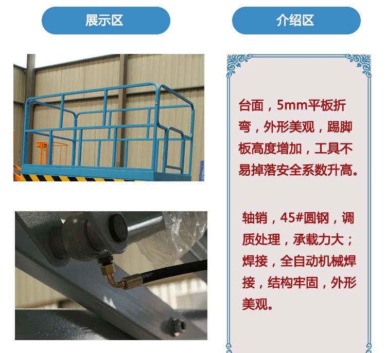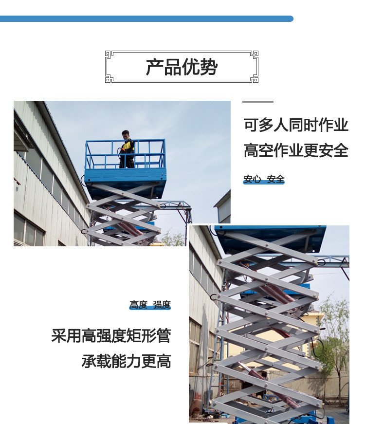 適合于機(jī)場候機(jī)樓、飛機(jī)搶修,車站、碼頭、商場、體育場館、小區(qū)物業(yè)、廠礦車間等較大范圍的高空連續(xù)作業(yè)。具有自動(dòng)行走的功能,能夠在不同工作狀態(tài)下,快速、慢速行走,只需一個(gè)人在空中便可操作機(jī)器連續(xù)完成上下、前進(jìn)、后退、轉(zhuǎn)向等動(dòng)作。機(jī)器處于停止?fàn)顟B(tài)時(shí),車輪始終處于制動(dòng)狀態(tài),并能在6度坡時(shí)可靠制動(dòng)。大直徑超寬優(yōu)質(zhì)橡膠車輪使得用戶地面得到有效保護(hù)的同車載式升降機(jī):是用途廣泛的高空作業(yè)專用設(shè)備。它的剪叉機(jī)械結(jié)構(gòu),使升降臺(tái)起升有較高的穩(wěn)定性,寬大的作業(yè)平臺(tái)和較高的承載能力,使高空作業(yè)范圍更大、并適合多人同時(shí)作業(yè)。它使高空作業(yè)效率更高,安全更保障。剪叉式高空作業(yè)平臺(tái)是用途廣泛的高空作業(yè)專用設(shè)備。它的剪叉式機(jī)械結(jié)構(gòu),使升降臺(tái)起升后有較高的穩(wěn)定性,寬大的作業(yè)平臺(tái)和較高的承載能力,使高空作業(yè)范圍更大,并適合多人同時(shí)作業(yè)。它使高空作業(yè)效率更高,更安全。