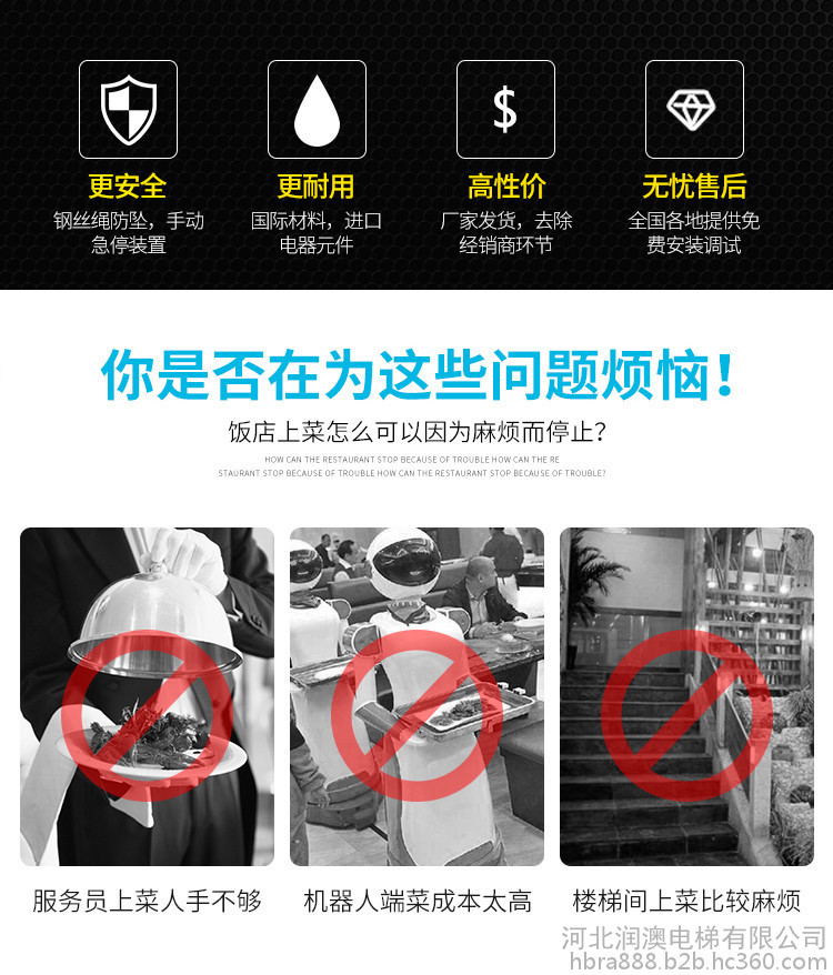 我公司生產的高質量雜物電梯,經濟節能,功能齊全,本著用戶是上帝,以求生存的原則,采用先進的歐洲技術,專業的生產,可靠的安裝,可靠及時的維修,竭誠為您的需求提供盡善盡美的系列服務。