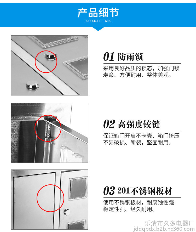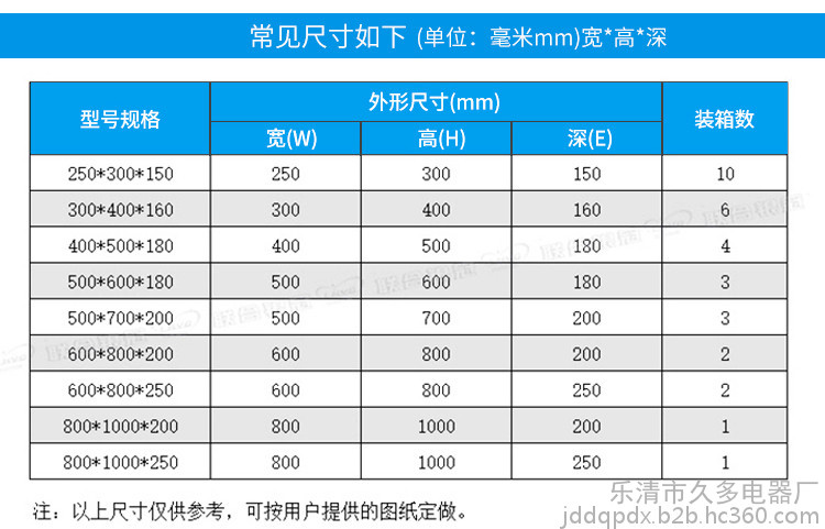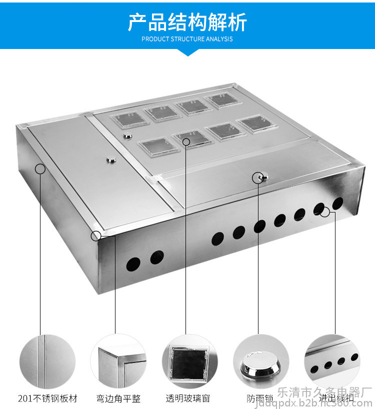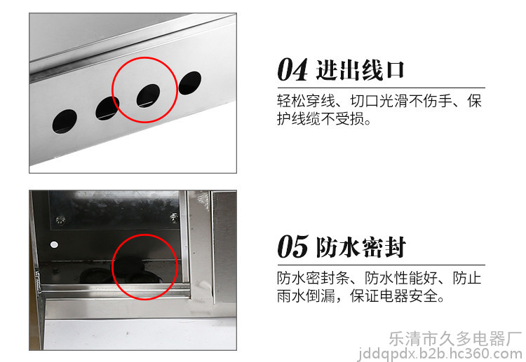 樂清市久多電器廠坐落在浙江樂清市柳市工業區,交通便 捷,至溫州機場及火車站幾十分鐘路程,近靠七里港口、享有“中國電器之都” 的美譽。同時,與風景區——雁蕩山、楠溪江毗鄰。 公司主要產品有:不銹鋼配電箱、不銹鋼電表箱、不銹鋼配電柜、不銹鋼基業箱、不銹鋼JP柜、不銹鋼光伏箱、不銹鋼計量箱、不銹鋼監控箱、不銹鋼戶內外配電箱、不銹鋼動力柜、不銹鋼農網柜、不銹鋼干式變壓器外殼、不銹鋼高低壓箱體、不銹鋼橋架及各類不銹鋼非標箱和成套設備等系列產品,質量可靠,外形美觀,產品廣泛應用于輸配電、機械、冶金、水電、石化、輕紡、礦山、交通等行業和隧道、建筑、舊城改造、城市農村電網改造以及其它建筑項目配套、單機使用和民用。不銹鋼配電箱產品銷往全國各地,具有很高的性能價格比,深受廣大用戶的信賴與好評。 公司嚴守“”的宗旨,從軟、硬件上建立了一套嚴格的質量管理體系,本公司專業生產不銹鋼配電箱、高低成套設備等系列產品。 真誠歡迎經銷商在各地設立銷售分公司,共同發展。 歡迎新老客戶前來蒞臨指導,洽談合作!
