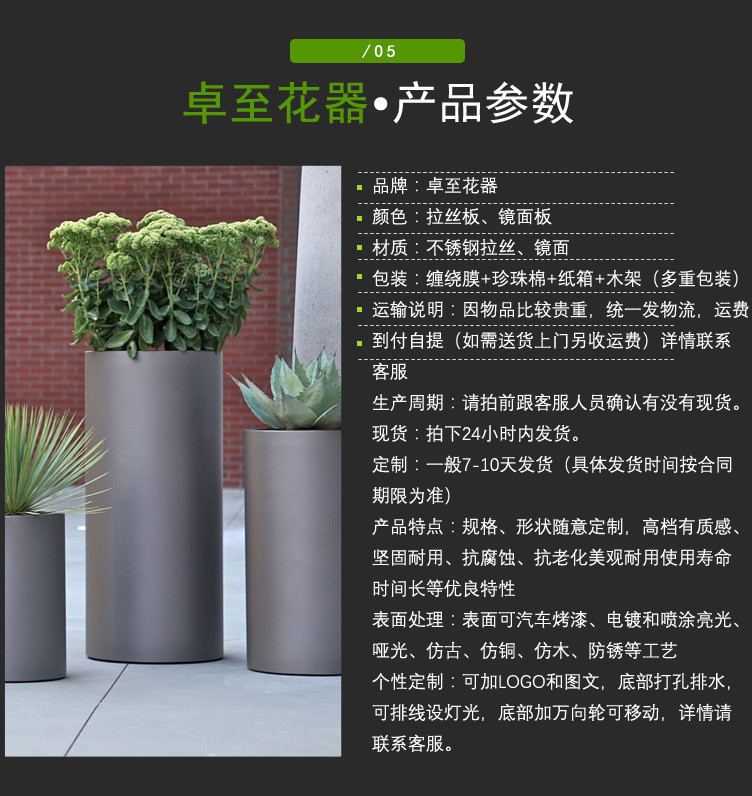杭州卓至展示有限公司生產(chǎn)高端不銹鋼花盆,可按設(shè)計(jì)打造各種造型,加上各種圖案。做出與眾不同的效果。用于廣場,市政園林,機(jī)關(guān)單位,賓館酒店,寫字樓等公共場所,相對于陶瓷類、樹脂類花盆、塑料花盆等,不銹鋼花盆簡潔高端大氣現(xiàn)代感,可以打造不同的造型。以符合現(xiàn)代裝潢中更高的需求。杭州卓至展示專業(yè)打造各種園花草樹木不銹鋼花盆。