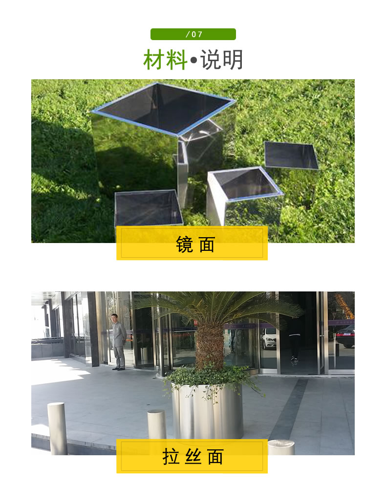 優(yōu)點(diǎn)一:不銹鋼花盆首先在美觀上來說是非常百搭的,金屬質(zhì)感給人一種高端大氣上檔次的視覺享受,顏色簡單卻不顯單吊,無論是在高端商業(yè)街,還是在普通小區(qū),無論是種花還是種草,什么顏色的植物,不銹鋼花箱的裝飾永遠(yuǎn)都不會(huì)顯得突兀。同時(shí),不銹鋼花盆的可塑性很強(qiáng),可以根據(jù)需要,定做拉絲,鏡面,電鍍,噴砂,烤漆等等,并且不脫落不褪色,同時(shí)可以制作不同的形狀樣式,與城市環(huán)境和景點(diǎn)等等相得益彰,造型簡約,大氣且美觀,百搭又好看。其次,剛才我們也有說到, 現(xiàn)在人們的環(huán)保意識(shí)普遍提高,甚至達(dá)到共識(shí),而不銹鋼花盆恰好很受這類人的青睞。不銹鋼花盆的材質(zhì)特性使它非常環(huán)保,可回收。因?yàn)檫@樣的優(yōu)點(diǎn),不銹鋼花盆也是重點(diǎn)推廣的節(jié)能產(chǎn)品。不銹鋼花盆的應(yīng)用和推廣也是我們?yōu)榄h(huán)保做出的實(shí)際行動(dòng)。