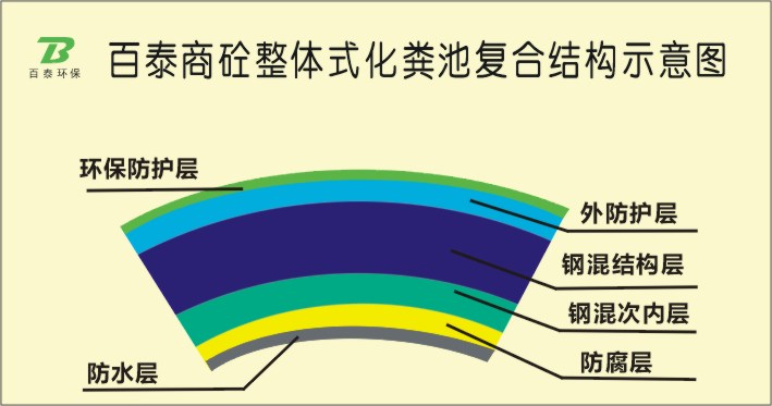 百泰商砼整體式化糞池產品采用符合標準的高強度混凝土預制而成,這種材料耐酸、耐油,經久耐用,對自然條件影響具有較好的適應性,對冷熱、凍融、干濕的變動,對糞便污水侵蝕、外力撞擊、水流沖刷都有一定的抵抗力,在正常使用情況下,是一種壽命較長的工程材料,使用壽命與建筑物同步,保用60年。