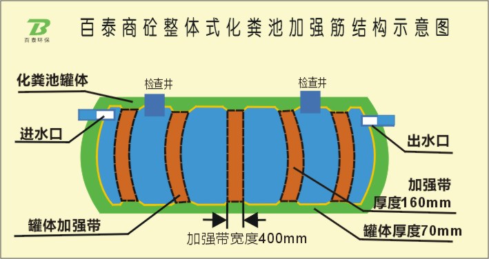 百泰商砼整體式化糞池是采用C30商砼混凝土、鋼筋、增強劑及防水材料制成,超強抗壓,耐腐蝕。商砼整體式化糞池采用鋼模整體成型工藝,整個筒體巧妙的利用拱形橋梁原理,抗壓強度極高。筒體內部間隔增加了內部加強筋的設計,更是增加了整個筒體的抗壓強度。這種設計是普通玻璃鋼化糞池強度的3~5倍,小區路面只要經過正常處理后,即可通行60噸重型卡車。