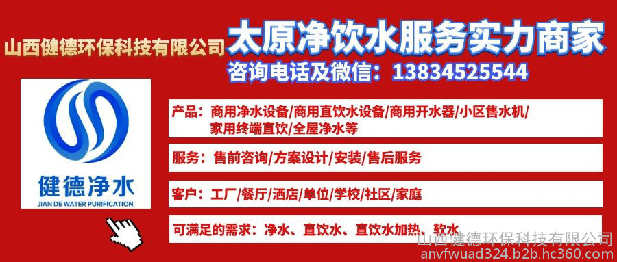 坐落于太原市民營經濟開發區,是一家專業銷售凈水設備和節能開水器及相關產品的企業。公司以客戶需求為導向,秉承自主創新,不斷在凈水和節能開水器應用領域進行研究和投入,通過公司員工的努力,甄選出行業內優質的產品,建立起了完整的產品線, 并為眾多的太原及周邊地區的用戶,提供了大量的價格比同行業低30%,但是產品質量普遍高于同行業的凈水設備和節能開水器及相關產品。 山西健德凈水,在產品的甄選上精益求精,從客戶需求出發,保證產品質量過關,讓客戶用著方便持久,在價格上,本著決不浪費客戶一分錢的原則,分毛必爭;在凈水方案的制定上,本著方案性價比高,保證客戶出水水質及水溫的原則,根據用量,場地,用水人數等條件一對一進行溝通定制,得到客戶的一致好評;在售后服務上,對每次服務的現場溝通,后期的電話回訪,每三個月或半年一次的免費上門水質檢測服務,全方位保證客戶的出水水質及設備運行的正常。 山西健德凈水將繼續不斷的致力于健康環保領域,綜合現代科技和未來趨勢,發揮整體團隊的創造力,以客戶個性需求為導向,以客戶滿意度為標準,強調全程貼身服務,并根據太原地區的水質情況,給您帶來國際水平的飲水,用水體驗。
