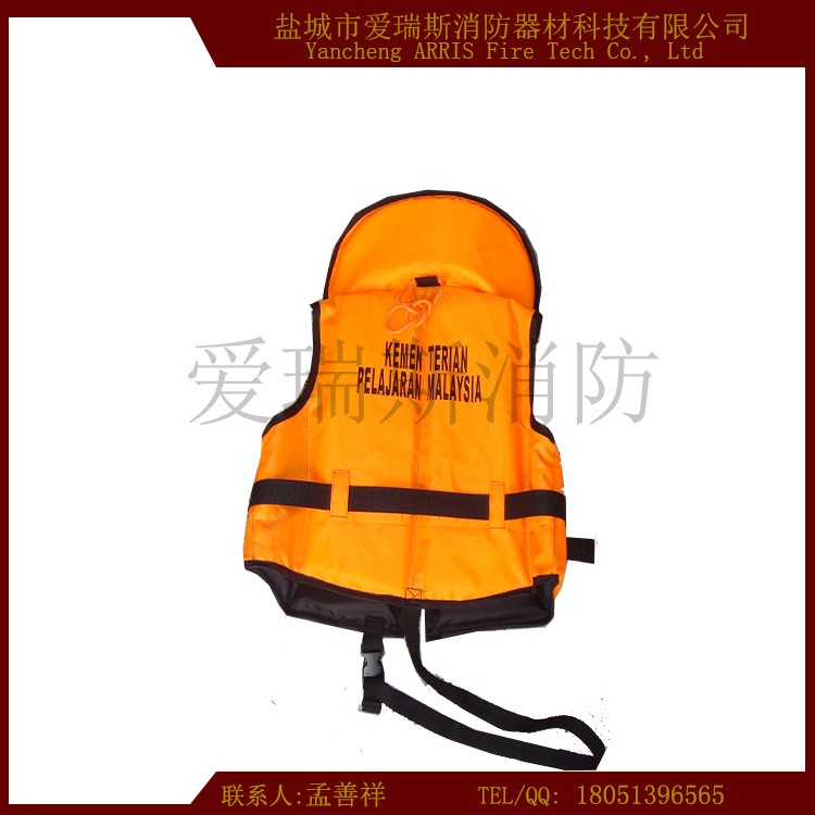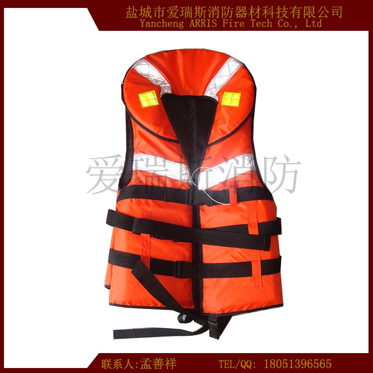 救生衣(a life jacket)又稱救生背心,是一種救護(hù)生命的服裝,設(shè)計類似背心,采用尼龍面料或氯丁橡膠(NEOPRENE),浮力材料或可充氣的材料,反光材料等制作而成。 一般使用年限為5-7年船上救生設(shè)備之一。一般為背心式,用泡沫塑料或軟木等制成。穿在身上具有足夠浮力,使落水者頭部能露出水面。