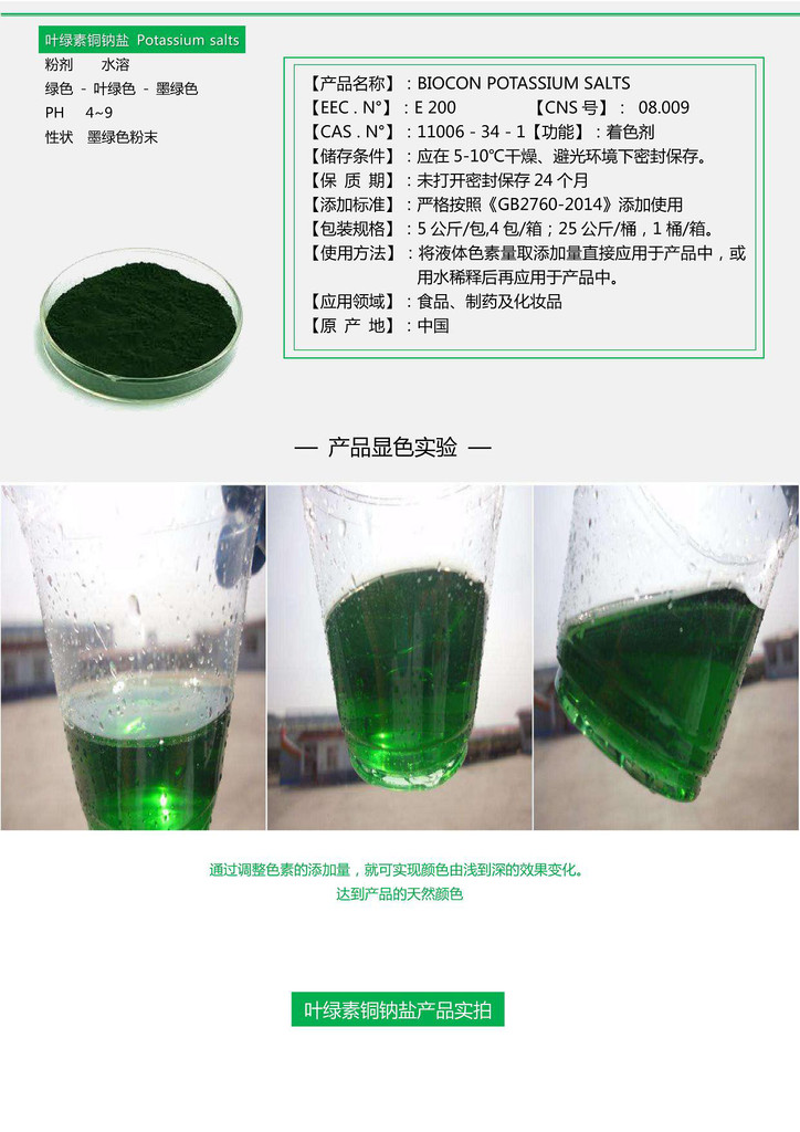 葉綠素銅鈉鹽是以葉綠素銅鈉鹽為原料經過精加工而成的色素。葉綠素廣泛存在于綠色植物中,現在多以植物(如菠菜等)或干燥的蠶沙為原料提取出葉綠素,再經科學方法加工得到葉綠素銅鈉鹽。葉綠素銅鈉鹽已被國際有關衛生組織批準用于食品上,也是我國批準允許使用的食用色素,已列入到我國GB2760-2014《食品添加劑使用衛生標準》中。葉綠素銅鈉鹽是將提取的葉綠素,經過皂化、銅化等反應,并經過精制而成。