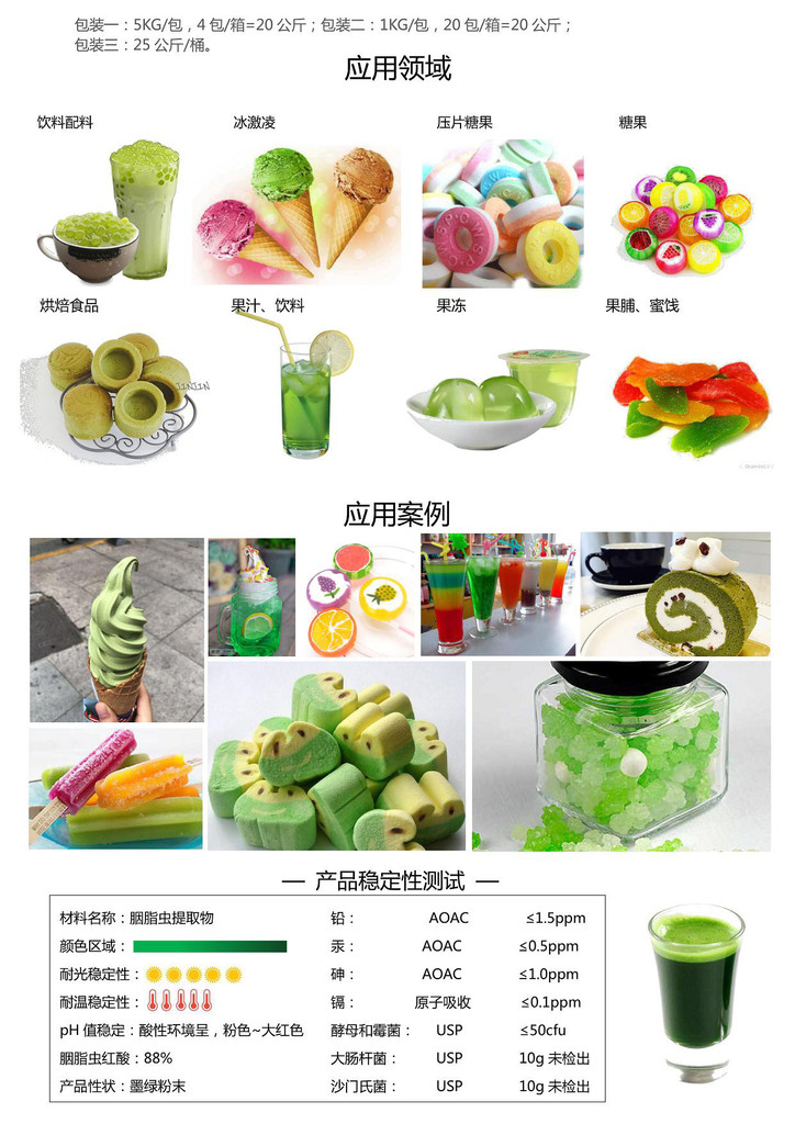 食用綠色色素。用于糕點、飲料、利口酒等。實際上常直接使用植物的葉或干燥粉末。例如,茶末、艾蒿、菠菜、小球藻等。添加于膠姆糖可消除口臭。
