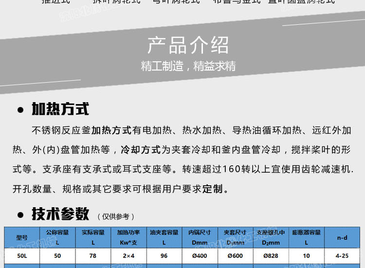 不銹鋼反應釜加熱方式有電加熱、熱水加熱、導熱油循環加熱、遠紅外加熱、外(內)盤管加熱等,冷卻方式為夾套冷卻和釜內盤管冷卻,攪拌槳葉的形式等。支承座有支承式或耳式支座等。轉速超過160轉以上宜使用齒輪減速機.開孔數量、規格或其它要求可根據用戶要求設計、制作。