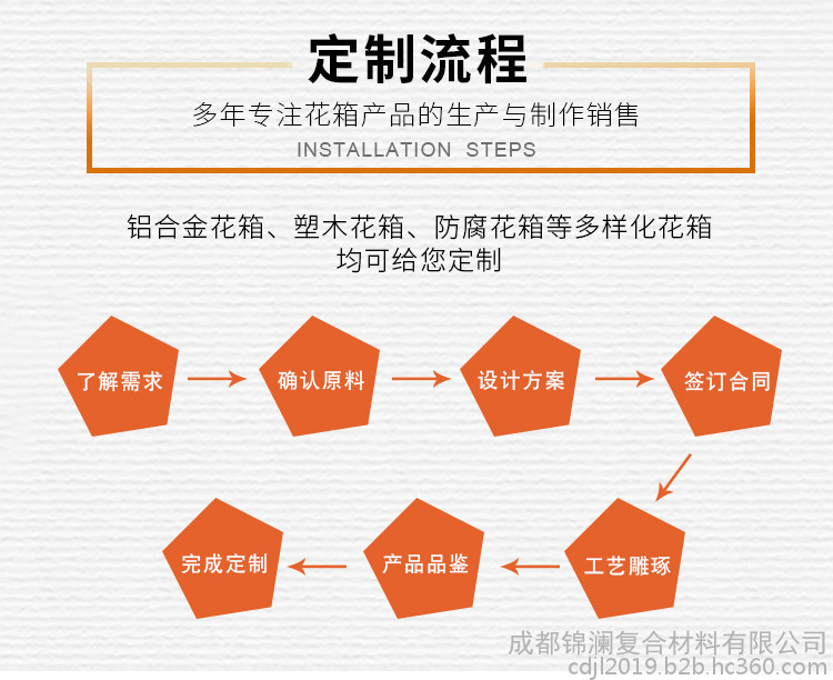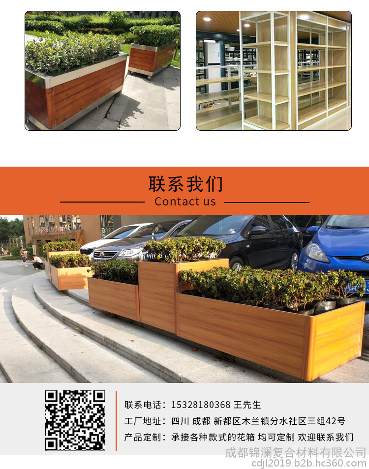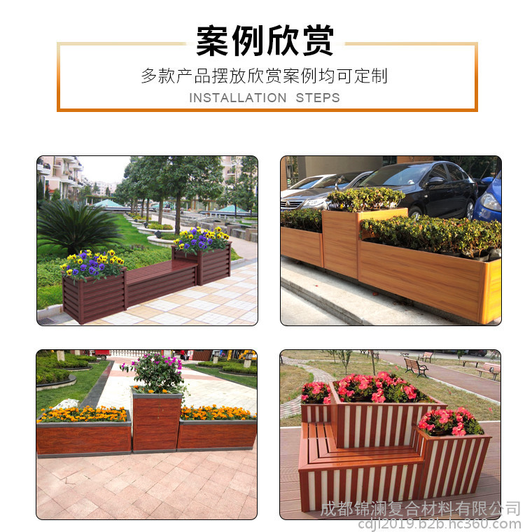 簡   介: 成都錦瀾復合材料有限公司是一家專業生產鋁合金花箱、塑木花箱、防腐木花箱等多樣化花箱的生產銷售廠家。公司產品款式新穎、風格獨特,可根據要求定制,本廠位于四川成都,交通便利,地理位置優越,風景秀美。 本廠生產的產品廣泛適用于的生活小區、休閑廣場、城市街道、園林綠化、商業樓宇、星級賓館、工廠、醫院、學校等各行各業。本廠對產品細節有著苛刻的要求,生產出的產品以其款式新穎、美觀大方、質量可靠、安全耐用、耐腐蝕、抗撞擊、能適應惡劣氣候等優點深受廣大客戶的喜愛。 成都錦瀾復合材料有限公司成立于2016年,為了貫徹“品質有保證、客戶有信心”的理念;在嚴格品質控管的生產流程下,產品合格率高達百分之九十五,在多年的銷售實踐中,公司積累了豐富的生產實踐經驗,確保生產出好的花箱制品。因其好的質量、迅捷的交貨及好的服務而得到廣大客戶的認可,并逐步建立起長期、穩定的合作伙伴關系。 本著“誠信經營、以人為本、開拓創新、以質取勝”的經營理念。不懈努力,與時俱進,做大做強企業。真誠希望與廣大新老客戶共創美好的明天。