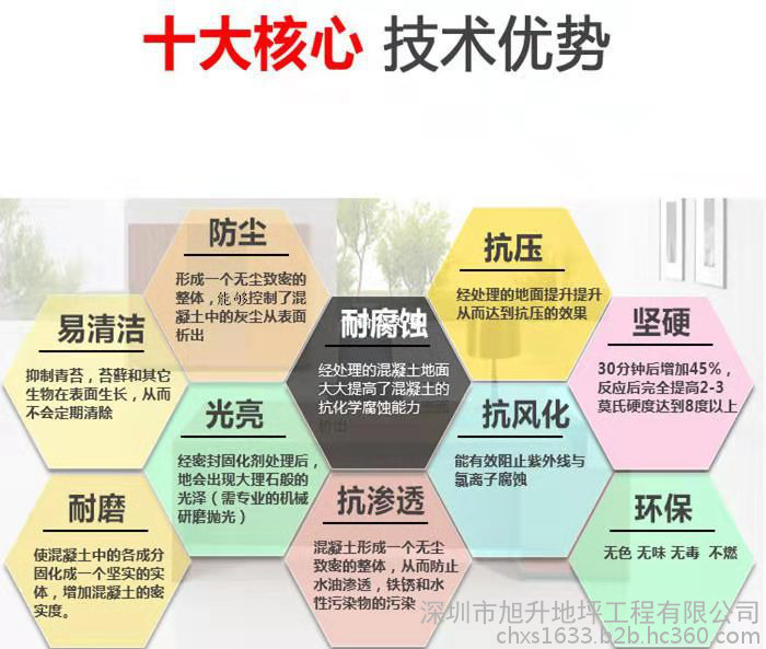 1.提高強度和硬能使混凝土的組成成分固化成一堅硬實體,形成一個三維空間網絡結構,從而增加混凝土的密度,強度及硬度,并極大地提高了混凝土的抗磨能力和表面耐候性。收光后平滑的表面,會產生像大理石一樣的美麗光澤。經過本產品處理過得混凝土,比未經處理,完全熟化的混凝土在30天后經抗壓實驗測定,強度增加四成以上,并且隨時間持續增加強度。
