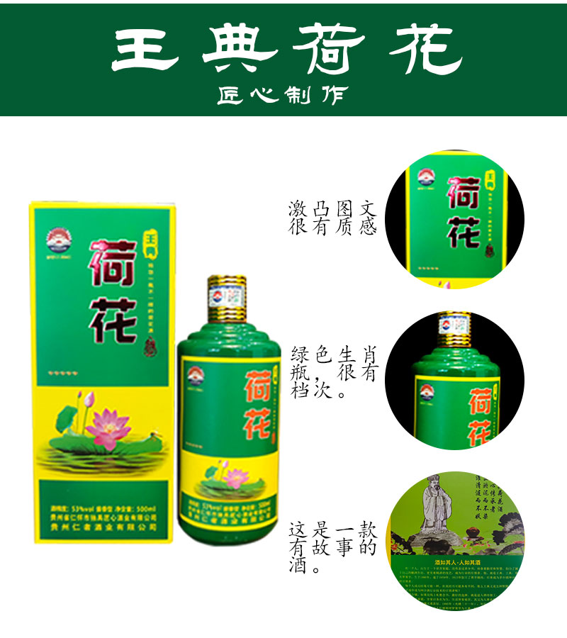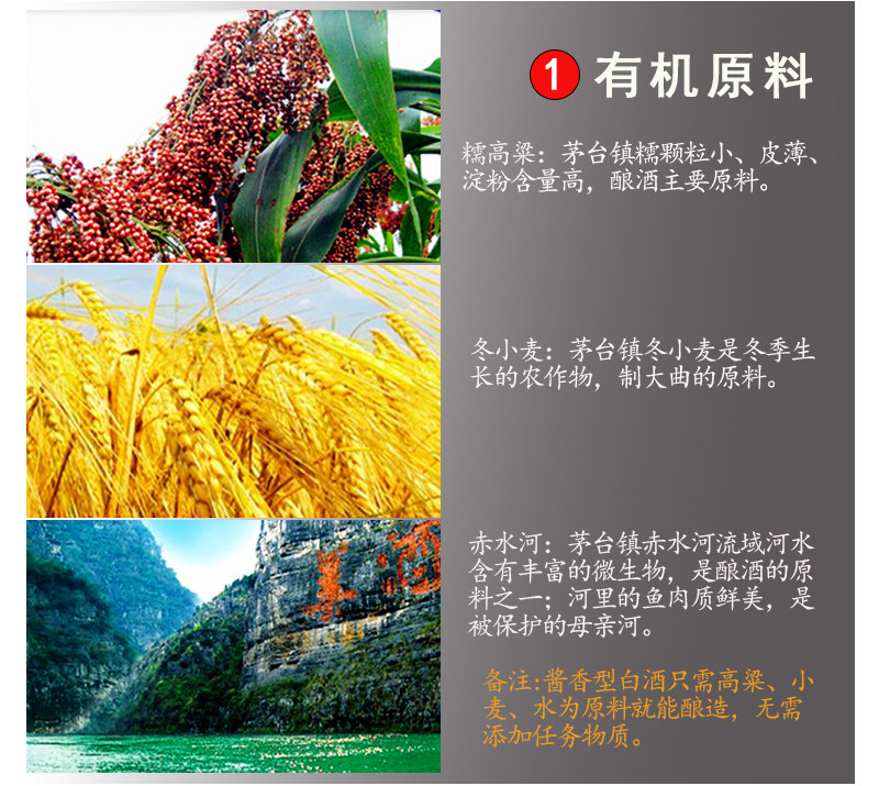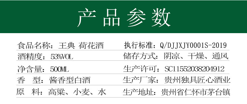 本公司主導(dǎo)產(chǎn)品為“王典”系列酒。以本地優(yōu)質(zhì)糯高粱,小麥為原料,取赤水河之靈泉秀水,按照茅臺酒的傳統(tǒng)工藝,精心釀制而成,所有成品酒,至少得經(jīng)過5年的儲存時間,使酒質(zhì)老熟,化驗合格后方能包裝出廠。具有醬香突出、酒體醇厚、優(yōu)雅細膩、空杯留香持久的特點!