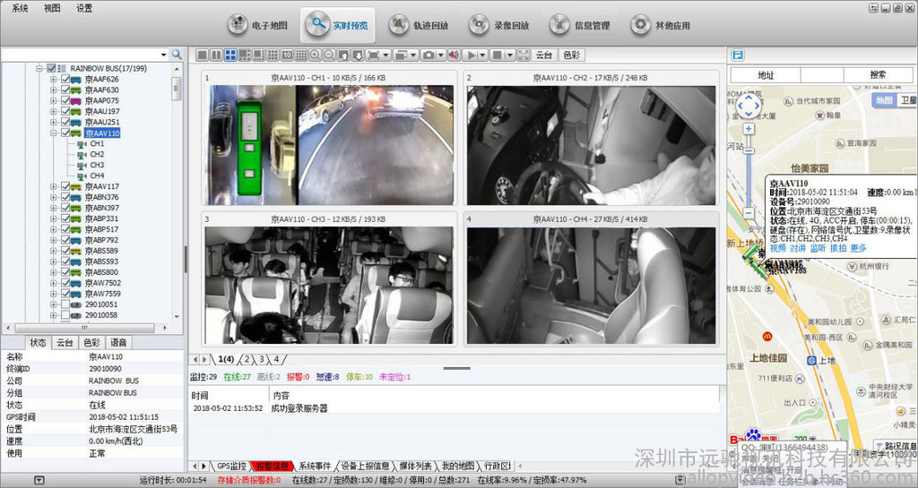 搭載4G遠程監控系統,通過手機APP或者客戶電腦端,隨時隨地查看車輛情況,4個車外360°無死角監控,車內3個360°監控車內司機、上下客和乘客情況,通過GPS或者北斗信號,實時知道車輛位置和車速,可通過服務器,查看以往的視頻和軌跡記錄,有效避免危險駕駛,乘客超載和其他一切危險駕駛行為。
