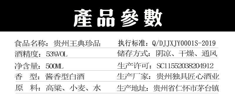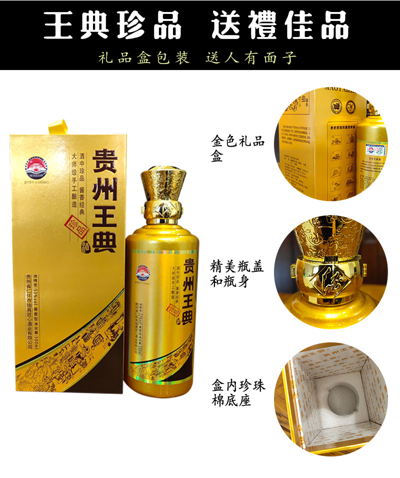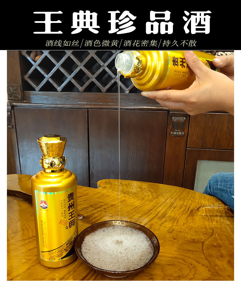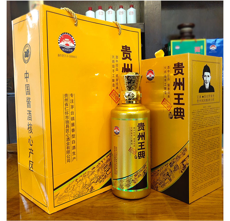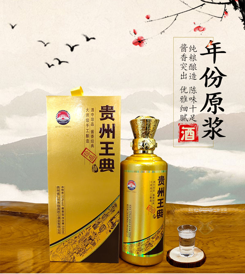 本公司主導(dǎo)產(chǎn)品為“王典”系列酒。以本地優(yōu)質(zhì)糯高粱,小麥為原料,取赤水河之靈泉秀水,按照茅臺酒的傳統(tǒng)工藝,精心釀制而成,所有成品酒,至少得經(jīng)過5年的儲存時間,使酒質(zhì)老熟,化驗合格后方能包裝出廠。具有醬香突出、酒體醇厚、優(yōu)雅細(xì)膩、空杯留香持久的特點(diǎn)!