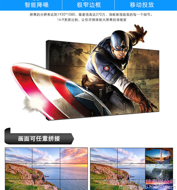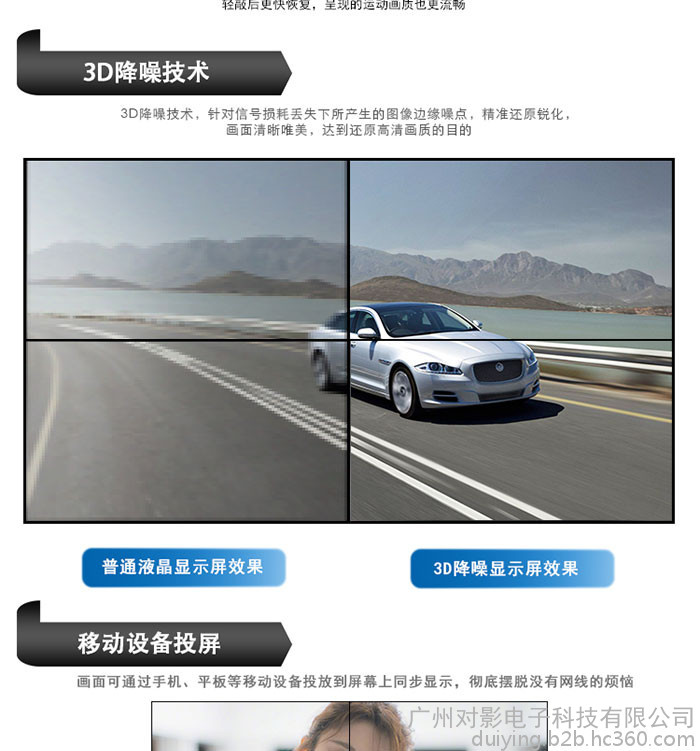 廣州對影電子科技有限公司是一家致力于液晶拼接墻、液晶廣告機、教學、會議一體機、全彩LED屏、等產品研發、銷售、安裝與服務為一體的高新技術型企業。 對影科技始終堅持以研發創新打造核心競爭力,一直持續加大研發投入并不斷致力于技術創新。每年將營業額的20%投入到研發中,公司的技術人員占員工總數的35%以上,從根本上保證了技術的持續創新的能力。 同時,公司采用國際化的現代管理模式,導入ISO9001:2008質量管理體系,并通過了CCC、CE、IEC、ROHS等認證。所有產品均經過嚴格測試,產品性能參數優于行業標準,立志為用戶制造值得信賴的高附加值產品。 對影科技擁有一支專業敬業、即時響應的高效客戶服務隊伍,又形成了以廣州、深圳、北京、上海、南京、成都、武漢、西安、鄭州、杭州、昆明等十多個中心城市為樞紐、覆蓋全國的區域營銷網絡,為客戶提供包括產品咨詢、工程安裝、技術支持和設備維護等全方位的貼身服務。 憑借成熟的質量管理體系、營銷網絡和售后服務系統,對影科技贏得了市場與 客戶的普遍認同,產品先后應用于平安城市、政府、場館、交通、能源、制造、金融、廣電、娛樂、醫療、教育等各個領域,遠銷海外。同三星、夏普、LG、SONY等眾多國際知名品牌建立了長期合作關系,用戶包括以萬科、沃爾瑪、體彩中心等國內外百余家企業。 對影科技本著“以客戶為中心”的服務宗旨,不斷提升產品品質,服務質量和性價比,持續為客戶創造價值!矢志成為您最可信賴的合作伙伴,為共同構建安全、和諧、輕松的高品質生活而不懈努力。
