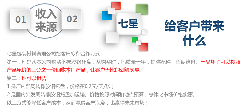 合肥七星包裝材料有限公司,自成立以來以環(huán)境環(huán)保智能為設計理念,集生產銷售租賃托盤綜合性的經營模式。以環(huán)保資源不浪費為宗旨,主要產品有:橡膠鋼托盤、橡膠包裝箱、橡膠倉儲籠、橡膠墊板、定制各種型號托盤支架,獨特的設計理念全國僅此一家,以上產品深受廣大客戶好評,本廠將在未來更好的研發(fā)新產品,為迎合智能時代的到來與更好的服務我們的客戶而努力!從合肥崛起的七星包裝材料有限公司,致力打造環(huán)保產品,鑄就輝煌強企。本公司大膽改革,超越極限,志存高遠,讓傳統(tǒng)工藝與高新技術恰當結合。我們用科學資源,文化凝聚力量,鑄就品質價值,用品牌與服務交流,贏取市場。七星包裝材料有限公司,歡迎客戶前來洽談合作,我們將給予各種方式合作,讓客戶滿意。